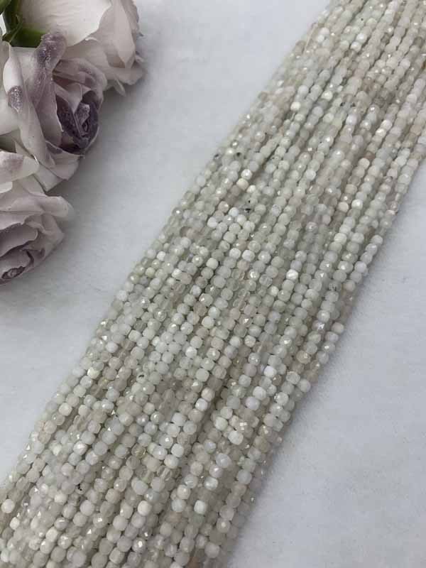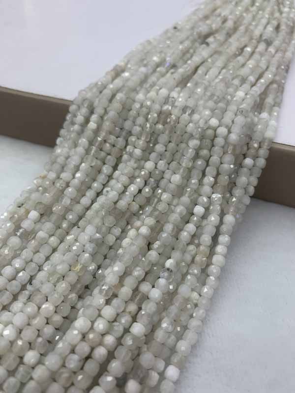 Moonstone cube beads long chain enhances intuition, inspiration and insight.