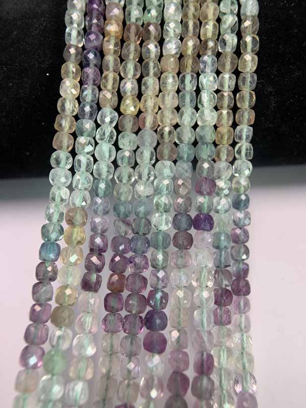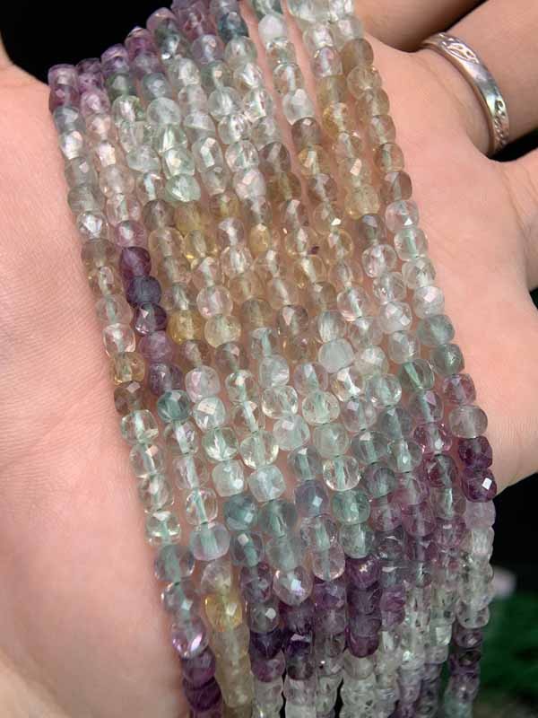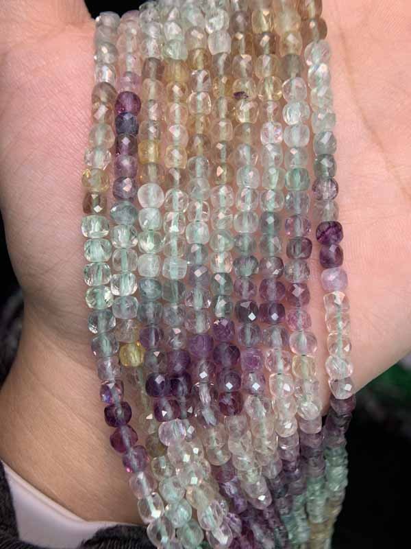 Rich colored faceted fluorite cube beads long strand: Unblocks energy flow, making expression clearer, more confident and persuasive.
