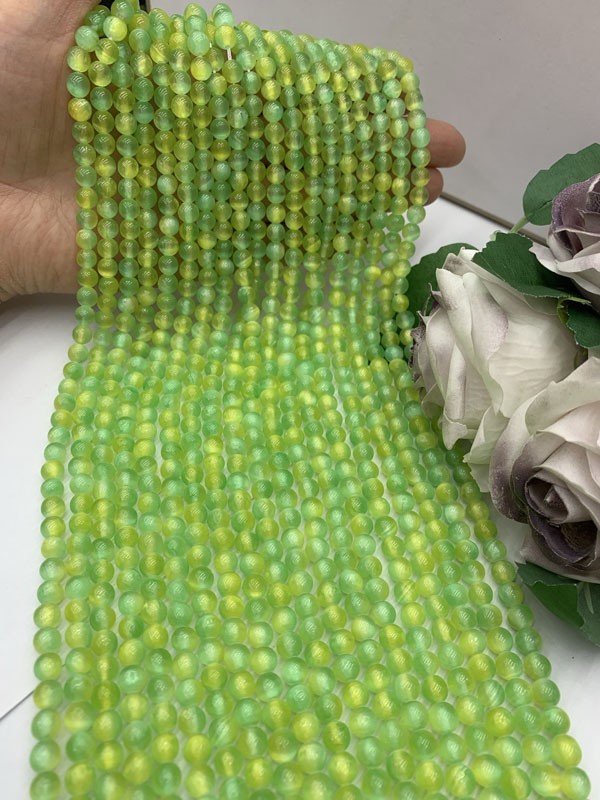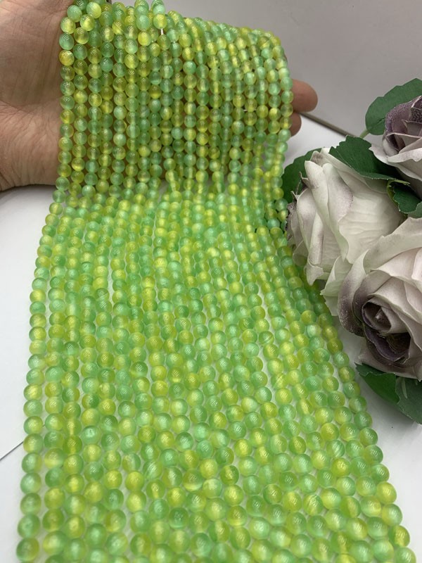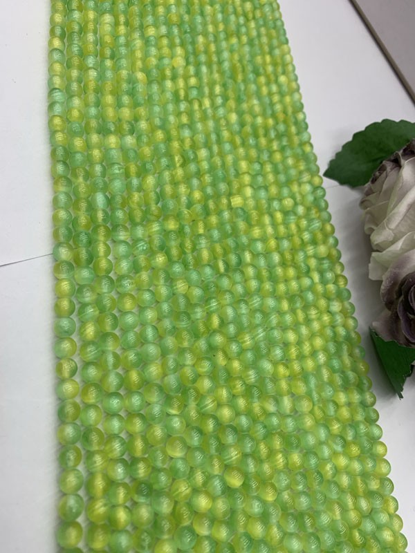 Yellow-green gypsum with cat's eye, smooth bead semi-finished long chain 38cm.